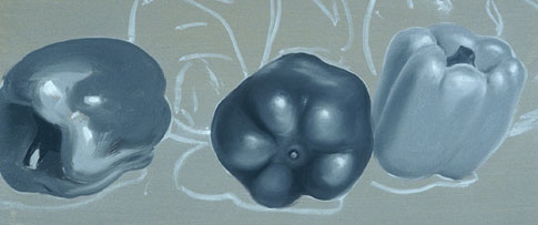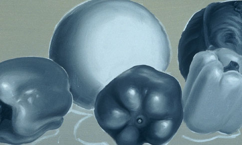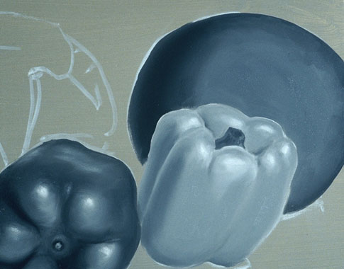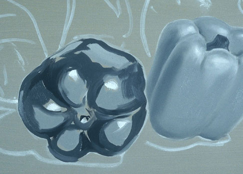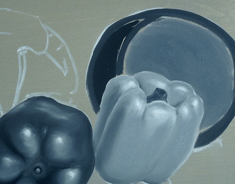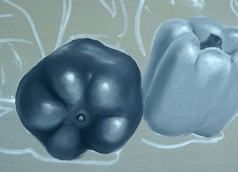 In this exercise the colors are seen only as lights and darks (or values). This painting will teach you to paint more complex forms than the previous exercise and it will teach you to see a color's value. Print out the source photo or create a colorful still life of your own to paint from.