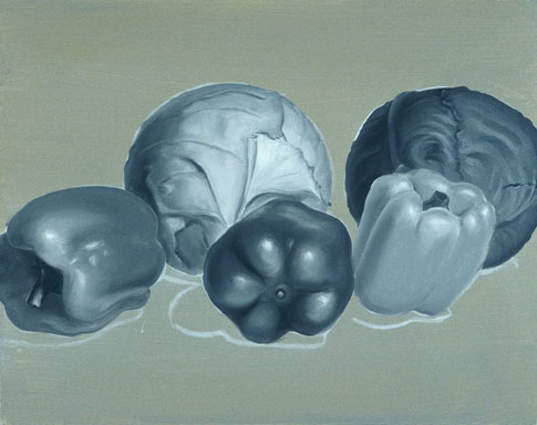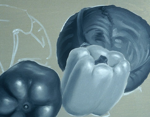 The texture of the cabbage leaves is then established working wet paint into wet paint. This is one of the advantages of a slow drying paint.
